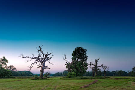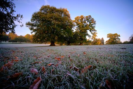 Chestnut trees on a frosty meadow under the blue morning sky during sunrise in autumn