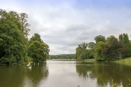Rural landscape with swans swimming in a lake, surrounded by trees.