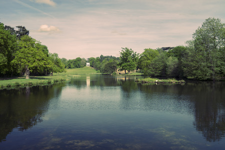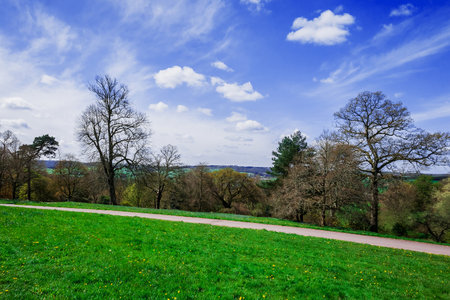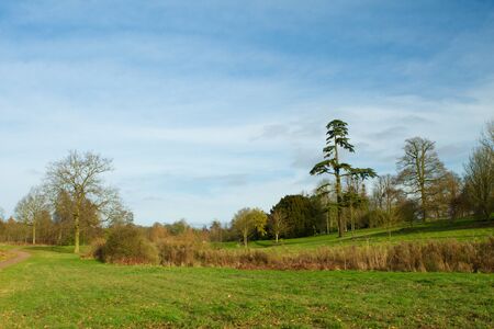 Beautifull vivid view for green and sunny field with trees and bright green grass and partial overcast, the Runnymede meadow in Old Windsor by Langham Pond, thousand year old picnic and polictic place