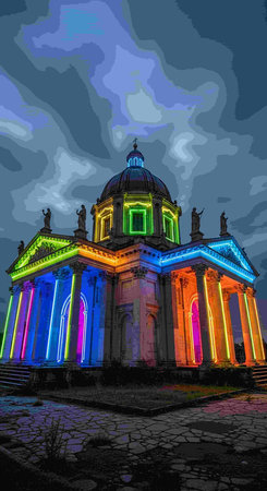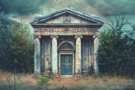 view of classical and historical building with foggy or stormy sky behind, created with generative ai