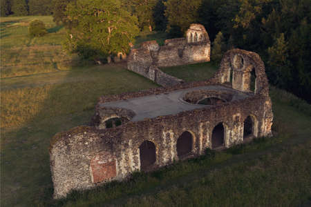 Aerial shot of Waverley Abbey Ruins in Surrey, England. Shot during Sunset using a drone in the middle of summer