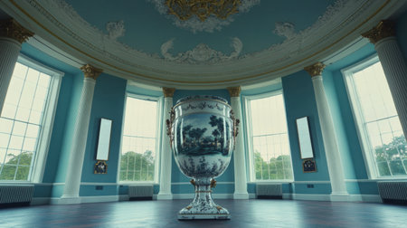 A stunning vase stands in a beautifully designed historic room, showcasing elegant architectural features and captivating natural light through large windows.