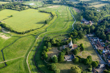 Aerial view of The Dashwood Mausoleum, built by Sir Francis Dashwood, on West Wycombe Hill, West Wycombe, Buckinghamshire, United Kingdom. 24th of June 2018