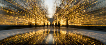 Golden lights blur into a dreamy pattern as people stroll through a festive pathway celebrating New Year with joy and excitement.