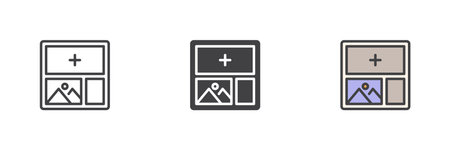 Grid layout with widgets and plus in different style icon set. Line, solid and filled outline versions. Color vector sign and symbol for dashboard, UI builder icon.