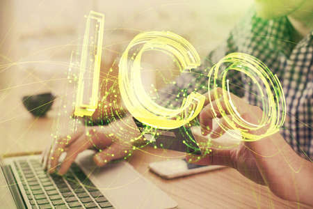 Mans hands working with notes background. Cryptocurrency and finance concept. Double exposure.