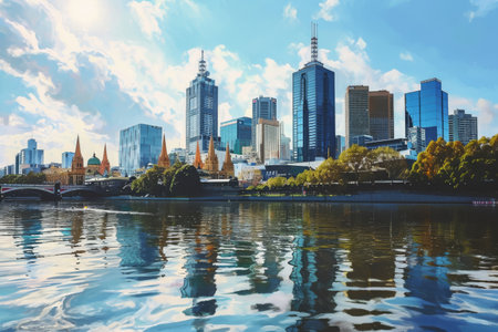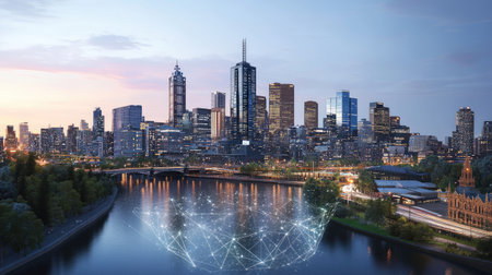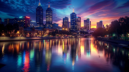 A breathtaking view of Melbourne's skyline at sunset, showcasing modern architecture reflected in the river, symbolizing urban beauty and technological connections.