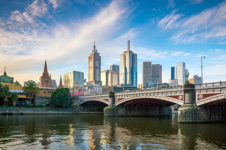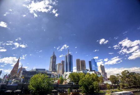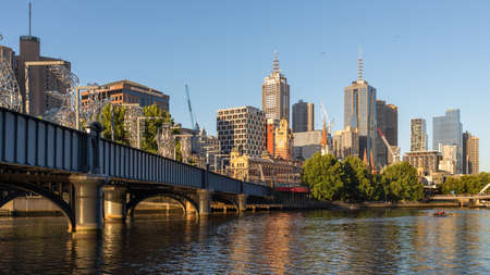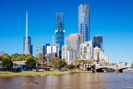 Melbourne Australia - March 10 2020; Urban modern city skyline with imposing tower office buildings rising above Yarra River