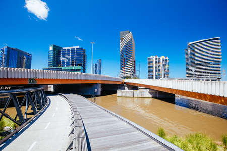 View of Seafarers Bridge on a bright sunny spring day Docklands, Melbourne, Victoria, Australia.