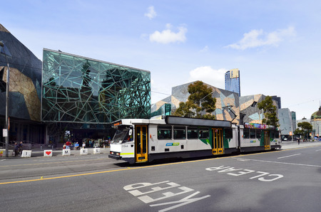 Melbourne, VIC, Australia - November 05, 2017: Unidentified people, tramway and federation square building, location for arts, culture and public events at CBD of Melbourne.