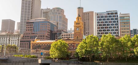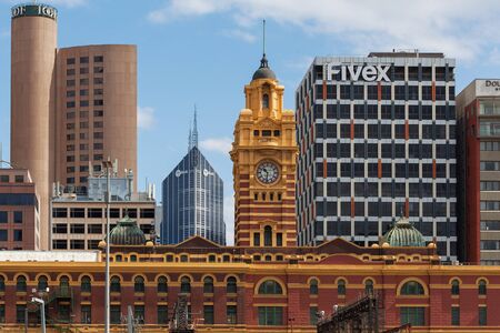 MELBOURNE - JAN 31 2016: Flinders street station clock tower and office high rise buildings in the background
