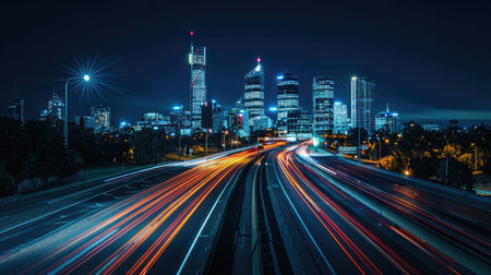 City at night, with its iconic skyline illuminated against a deep blue sky, featuring a bustling highway overpass adorned with motion-blurred cars traversing the scene