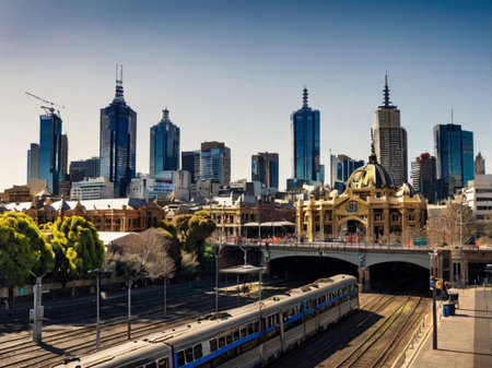 Melbourne railway station with modern skyscrapers.