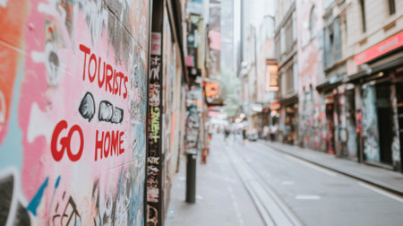 Curvy narrow street with residential buildings and protest graffiti Tourists Go Home, overtourism concept, AI Generated
