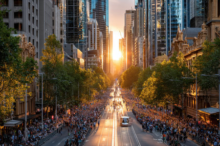 A large crowd gathers on a city street during a vibrant sunset
