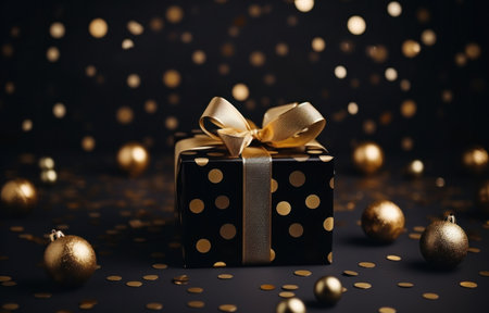 christmas gift in black box with golden balls on background flat black confetti.