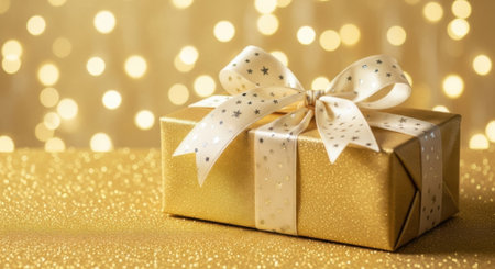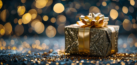 A beautifully wrapped golden gift box adorned with a glittery bow and ribbon, surrounded by sparkling decorations that create a festive atmosphere.