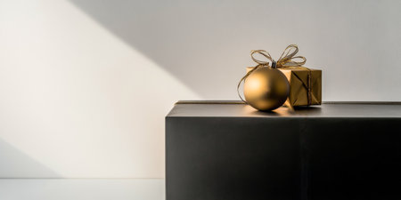 A golden ornament sits beside a neatly wrapped gift box on a dark table, enhanced by gentle shadows and soft light in a minimalist design.