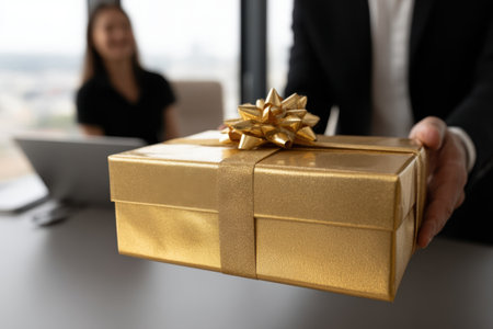 Businessman in Tailored Suit Presenting a Gift Box to a Woman in Office Setting