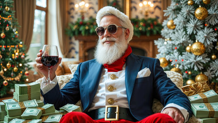 Cool Santa in sunglasses relaxes with wine, surrounded by money gifts and a glowing Christmas tree.