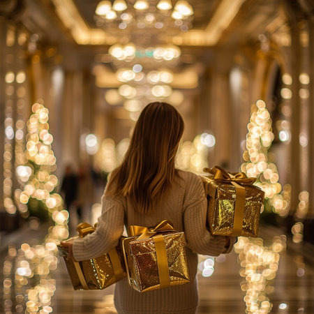 A woman carries golden wrapped gifts through the elegant and warmly lit hallway of a luxurious hotel. Soft, blurred Christmas trees twinkle, hinting at festive celebrations and joyful moments.
