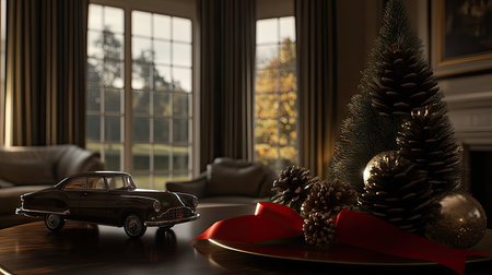 A vintage toy car with pine cones and red ribbon on the table in front of an elegant living room, close-up shot. The scene is captured using a Canon EOS R5 mirrorless camera paired with an RF24-70mm f/2.8 lens. --chaos 30 --ar 16:9 --v 6.1 Job ID: f4153a22-1fae-4c6b-99ea-ff3ab96c555a