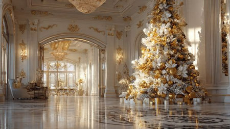 A breathtaking view of a luxurious lobby adorned with a magnificent Christmas tree, twinkling lights, and elegant ornaments, creating a warm festive ambiance.
