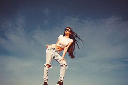 Sexy fashionable lady and Fashion trend. Modern girl attractive sexy body posing sky background.