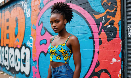 A young woman stands in front of a colorful graffiti wall, looking directly at the camera