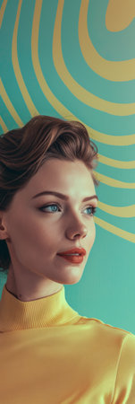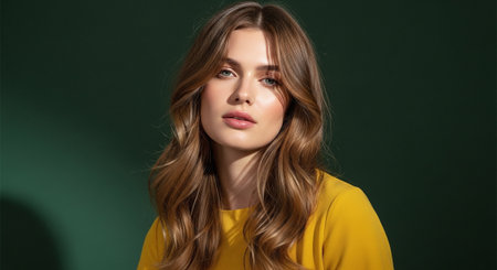 A young woman stands against a vibrant yellow wall, her long hair cascading over her shoulders. She gazes thoughtfully, enjoying the bright ambiance of this contemporary setting.