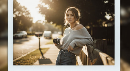 A young woman leaning against a wooden fence, holding a camera, wearing a cozy sweater, in a sunlit street scene