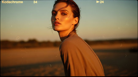 A young woman with wavy hair stands against a textured wall showcasing a confident expression. The warm light highlights her features capturing the essence of urban beauty at sunset.