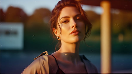 A woman stands against a city background with her hair blowing in the wind. The soft light of the golden hour accentuates her features and creates a captivating atmosphere.