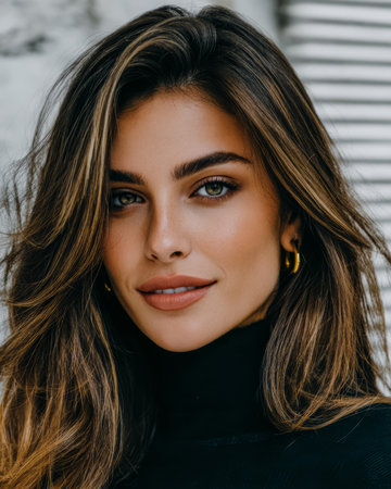A woman with wavy, long hair stands against a light wall while wearing a black sweater. Her look is elegant and natural, exuding confidence. Soft light highlights her features.