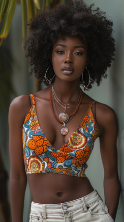A model in bold graphic print outfit showcasing vibrant colors and style