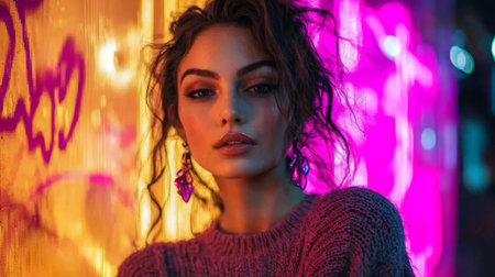 Under the glow of colorful neon lights, a young woman poses confidently, her wavy hair framing a striking face. She showcases a stylish outfit, embodying urban chic in a lively atmosphere.