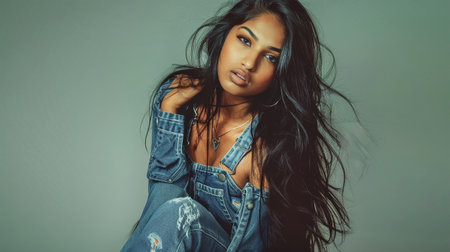 A young Indian woman poses confidently in a denim outfit against a soft green backdrop. Her long, dark hair flows freely, adding to the overall sense of effortless grace.