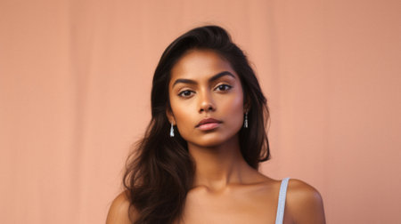 This young woman with long, dark hair poses confidently, wearing elegant earrings. The neutral background enhances her features, creating a captivating look full of charm.