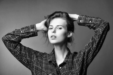young sexy fashionable woman or girl with long brunette hair and pretty face in stylish red checkered shirt in studio on grey background