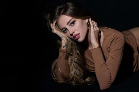 Sensual woman with light on a black background. Beautiful female face in the darkness. Tender and seductive look. Fashion art studio portrait. Sexy girl in sensual seductive pose on black studio.