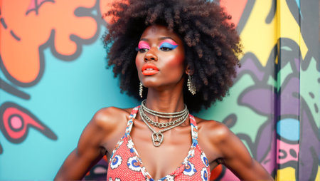 In a lively urban setting, a black woman poses confidently, showing striking makeup featuring bright colors and bold jewelry. The colorful mural behind adds visual energy.