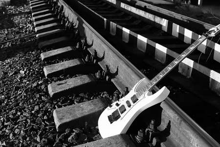 The image features parallel railway tracks stretching into a distant, hazy vanishing point. The monochromatic tones emphasize the gravel and steel, with diffused lighting from an undefined source. The composition focuses on perspective, suggesting travel, transportation, and concepts of time. This image has potential uses in editorial projects or commercial designs.