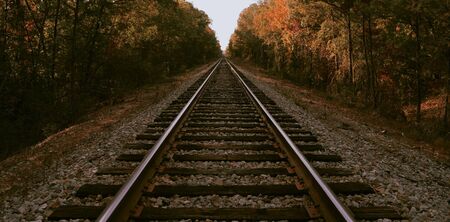 A tranquil view of railroad tracks during autumn, bordered by vibrant trees. The perspective captures the warm colors of the season, evoking a sense of journey and solitude on a quiet day.
