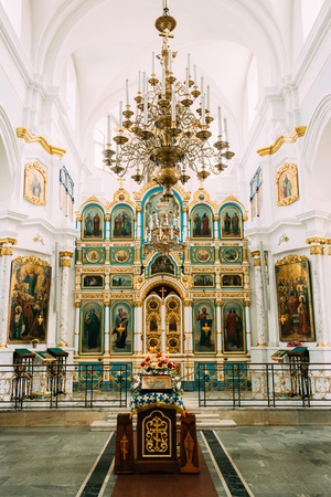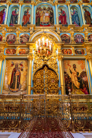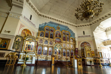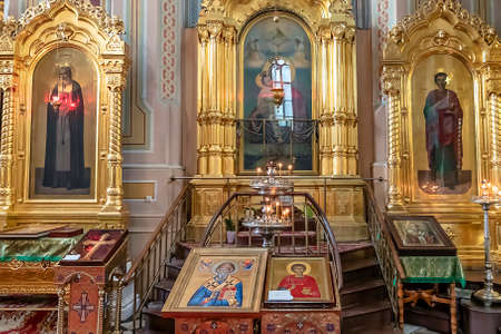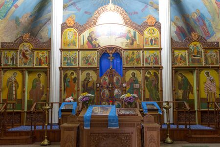 view of the Orthodox church inside with beautiful icons. Barnaul Russia September 15, 2021