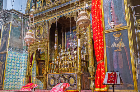 JERUSALEM, ISRAEL - FEBRUARY 16, 2016: The central altar and iconostasis in St James Cathedral, decorated with the complex wooden carvings and medieval icons, contains the holy relics, on February 16 in Jerusalem.
