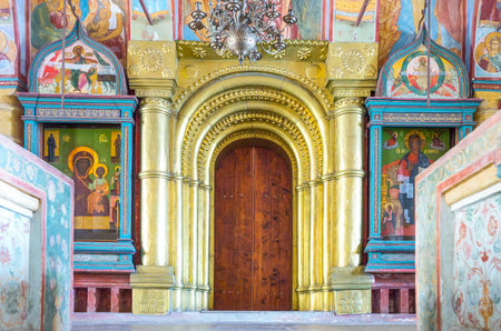 Novyi Svet, Donetsk region, Ukraine - October 06, 2019 year. Iconostasis and painting of the interior of the temple in honor of the Kazan Icon of the Mother of God. Front view to the Royal Gates