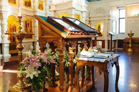 Orthodox Church. Christianity. Festive interior decoration with burning candles and icon in traditional Orthodox Church on Easter Eve or Christmas. Religion faith pray symbol