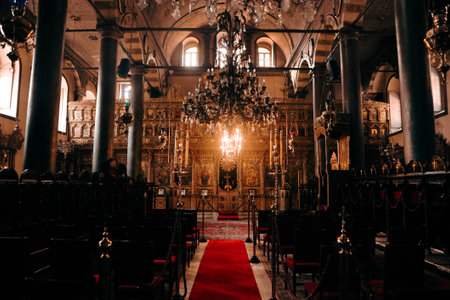 Interior of Orthodox church in Pogradec. Architecture and religion concept. Pogradec City, Albania.