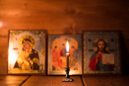A burning candle against the background of orthodox icons in a dark room