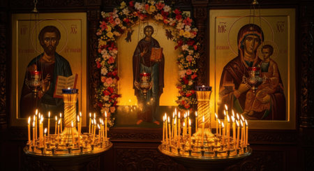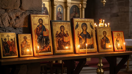 Sacred icons and candlelight in historic church setting.